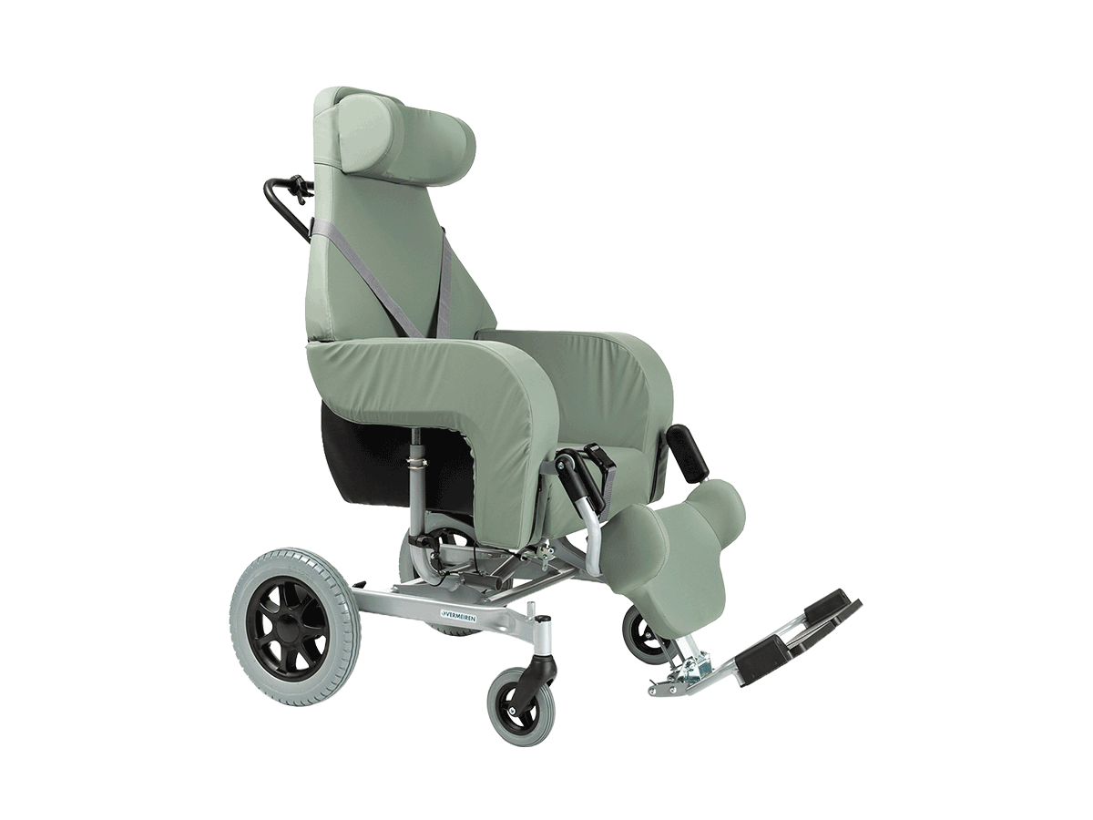 The multiple comfort features include a higher backrest to better support tall users, padded removable headrest, adjustable padded calf support for correct leg length, 8cm seat cushion, 40º tilt in space and adjustable footrest angle. The larger rear wheels make the chair easily manoeuvrable with a convenient foot operated drum brake.