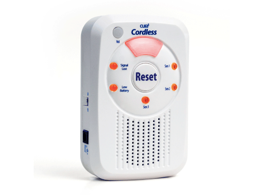 The Cura1 Three Channel Cordless Falls Monitor can monitor up to 3 cordless pads/ mats or other Cura1 cordless transmitters and 1 hard-wired Cura1 sensor.