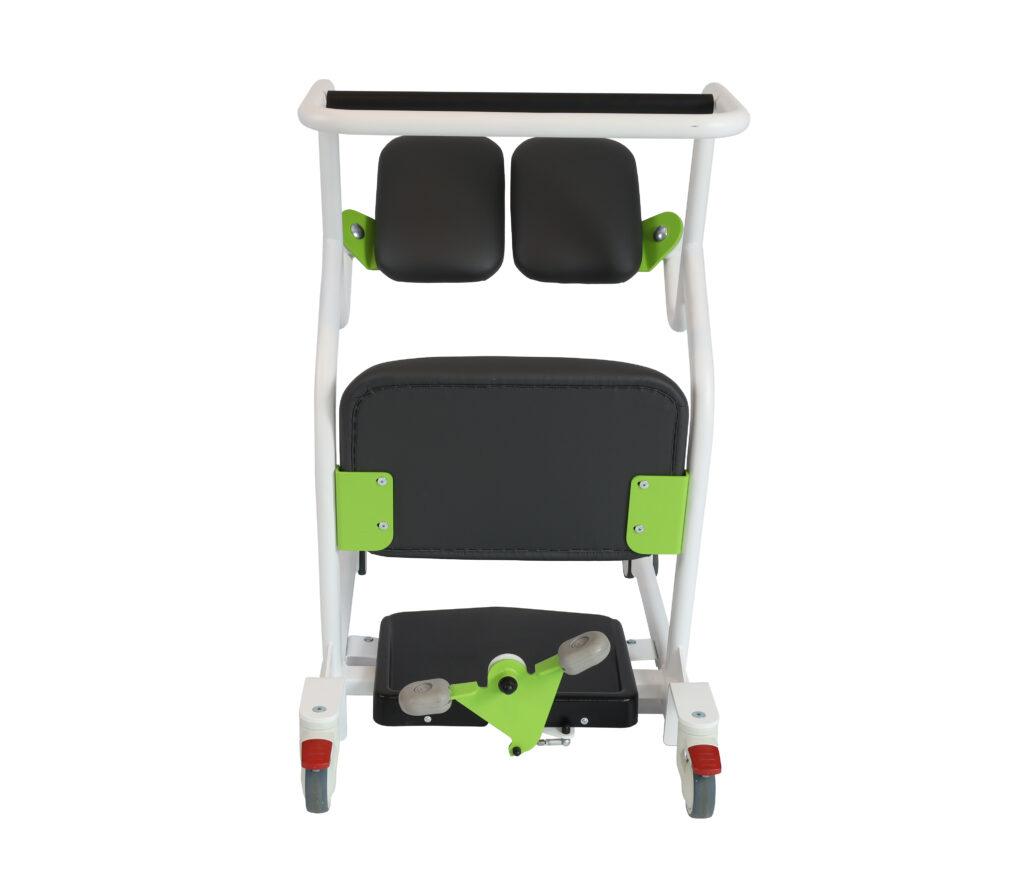 The height-adjustable and padded lower leg/knee support supports the user's legs during transfer. The sturdy non-slip footboard allows the user to easily position their feet and pull themselves up to a standing position using the crossbar. By simply turning the ergonomic seat supports, the Mobi Pro Flexi II becomes a comfortable chair on which the user can be moved.