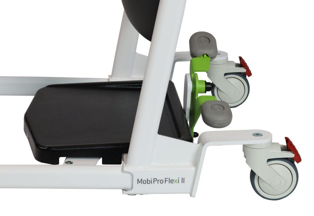 The Mobi Pro Flexi II can effortlessly move a user up to 180 kg. The compact and ergonomic design of the Mobi Pro Flexi II allows a single caregiver to support the sit-to-stand transfer of the client to bed, chair or toilet. The Mobi Pro Flexi II is equipped with a mechanical leg spreader with foot pedals.