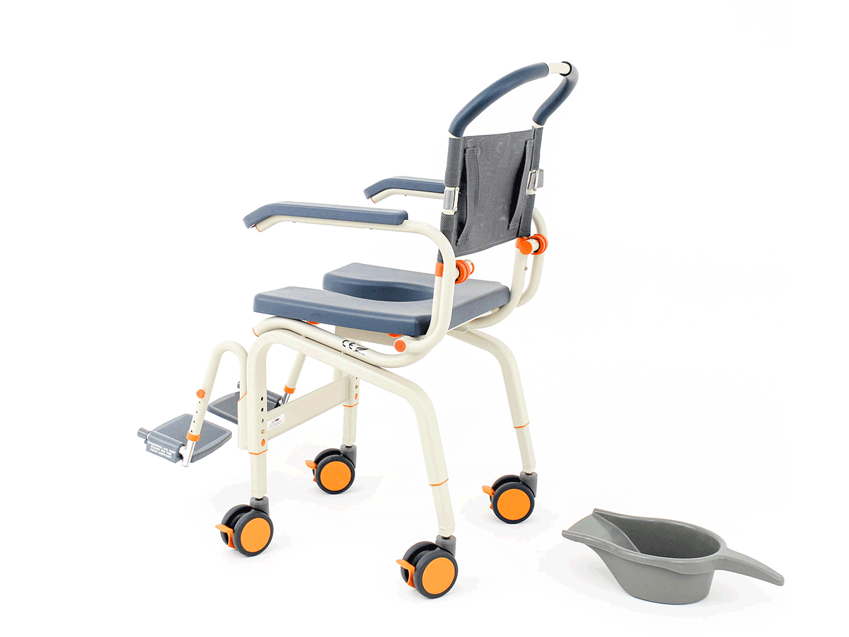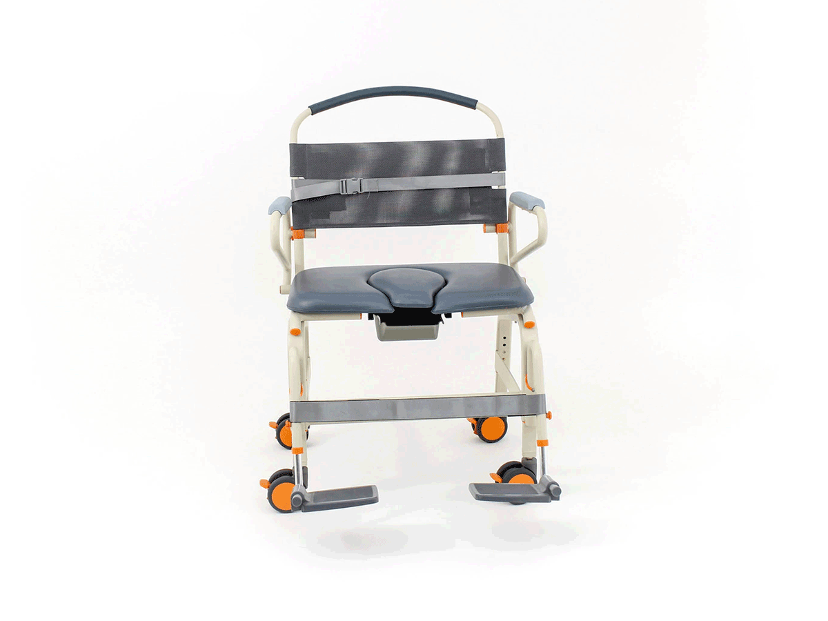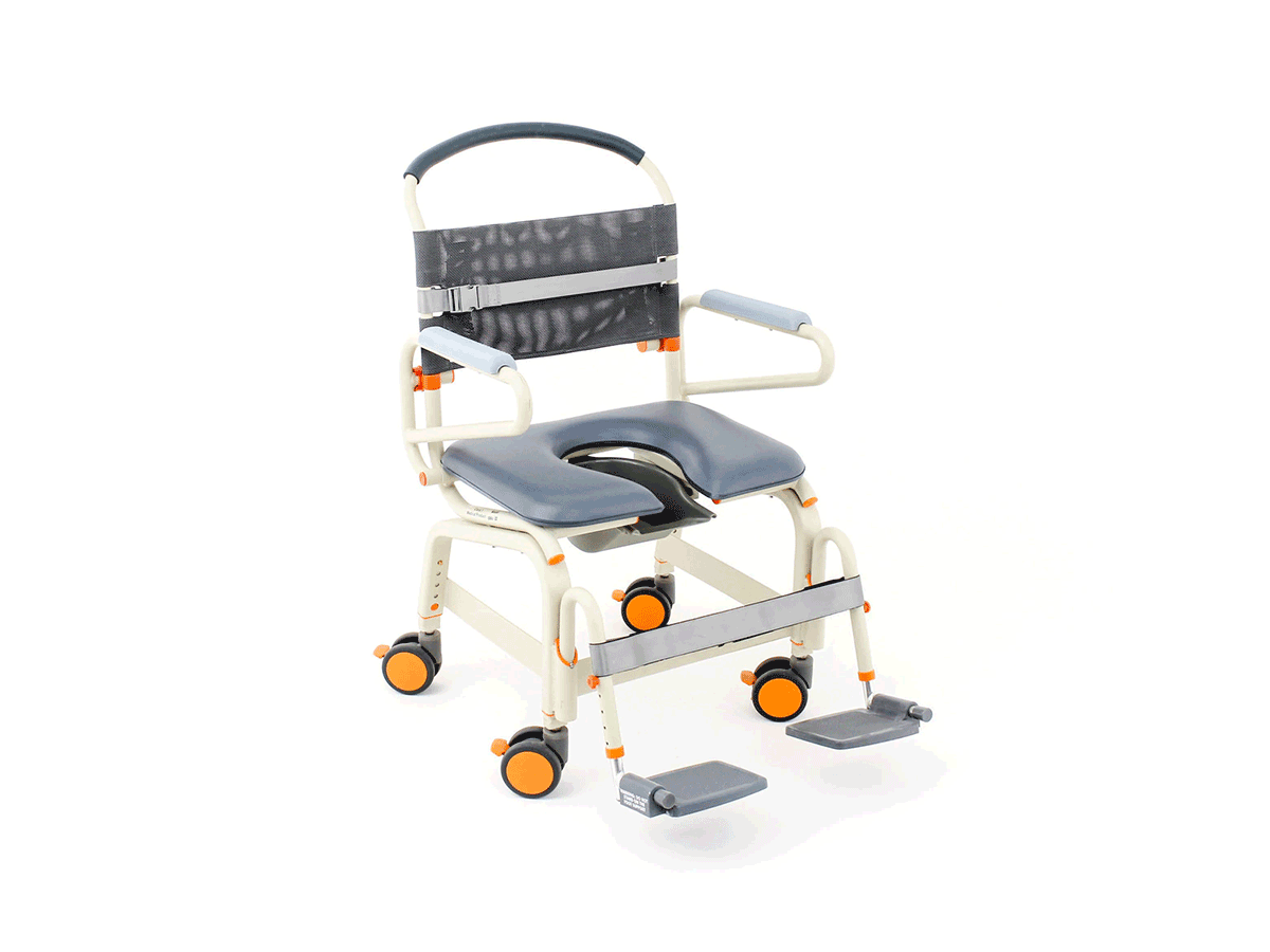 The SB6c Roll-In Range of ShowerBuddy mobile shower commodes comes in 3 seat width options: 46cm | 56cm | 66cm. This versatile, lightweight shower commode easily rolls over most standard toilets or accommodates a commode system and the no-rust aluminium frame means you can wheel it straight into the shower. The four casters are all lockable and the safety belt can be used across the chest or over the lap. The seat is height adjustable as are the footrests. The flip-up footrests can also swing away or be removed. The armrests are removable or can be flipped back out of the way for easier side transfers.