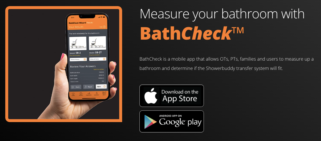 TRY THE BATHCHECK APP OR ONLINE MEASURING TOOL - BathCheck is a mobile app that allows OTs, PTs, families and users to measure up a bathroom and determine if the Showerbuddy transfer system will fit.