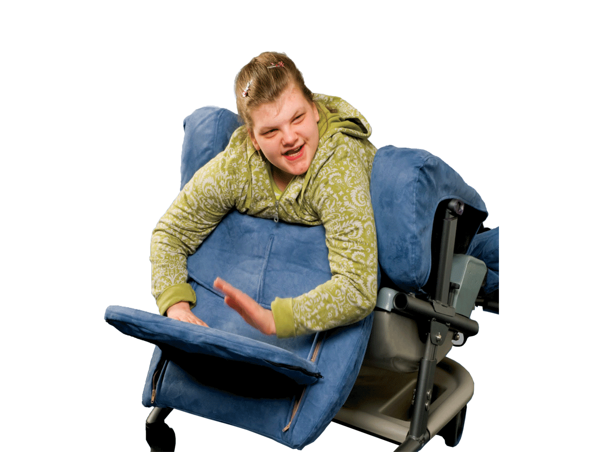 The Symmetrikit chair can be quickly repositioned to a more upright position for mealtimes, tilted head down for postural drainage and even used “back to front” as a wedge for prone stretching.